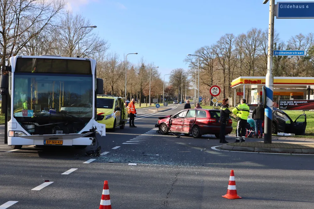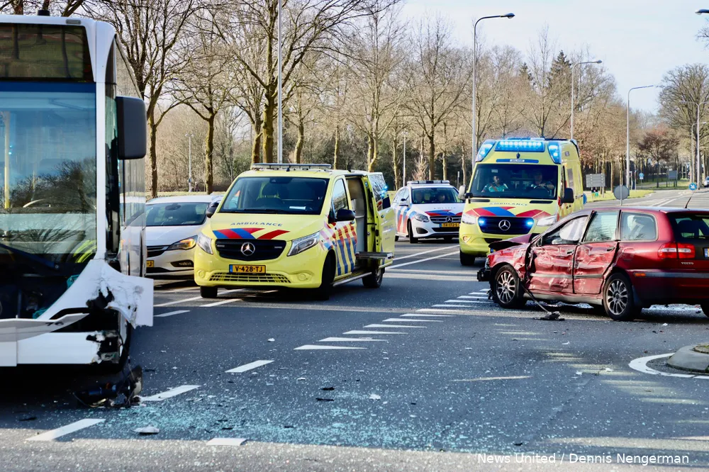 Twee personen uit een personenauto zijn met spoed overgebracht naar het ziekenhuis. In de bus zaten drie passagiers. Eén daarvan is door ambulancepersoneel nagekeken.