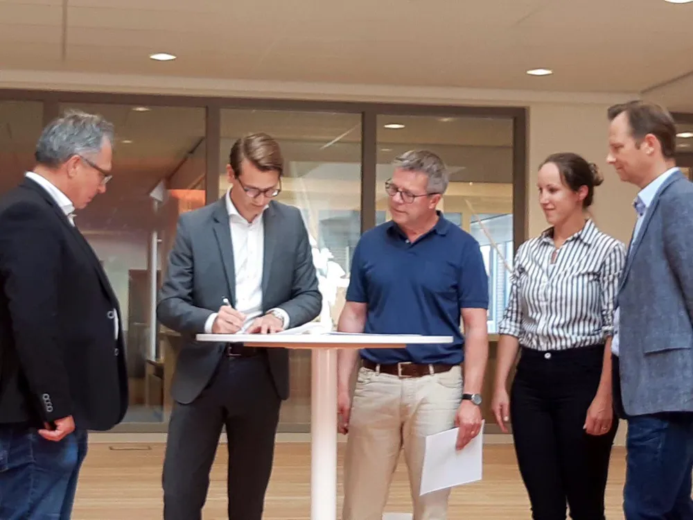 Wethouder Jaimi van Essen zette namens de gemeente zijn handtekening onder de opleveringsovereenkomst. "In april 2018 is gestart met de revitalisatie van het Twents Carmel College Losser. In de eerste maanden hebben we wat vertraging gehad, maar daarna is de verbouw voorspoedig verlopen, waardoor de nieuwbouw vandaag kon worden opgeleverd. De samenwerking met Marku Bouw uit Lichtenvoorde en combinatie Brusche/Engberink uit Almelo is uitstekend verlopen. Er staat nu een prachtig gebouw waarmee het voortgezet onderwijs en het muziekonderwijs heel wat jaren vooruit kan."