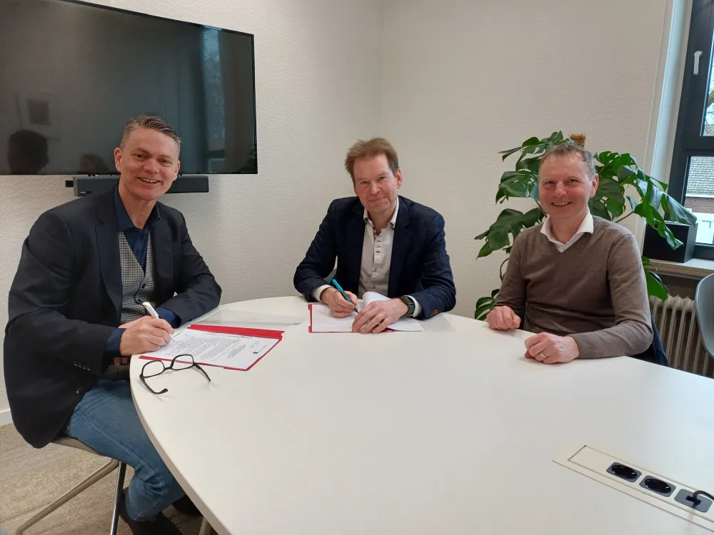 Donderdag 21 maart tekenden wethouder Jan Engels samen met Henk Wiggers en Marko Hartmann vanJOUW Wonende koopovereenkomst voor het perceel op de hoek Enschedesestraat-Zweermanstraat.