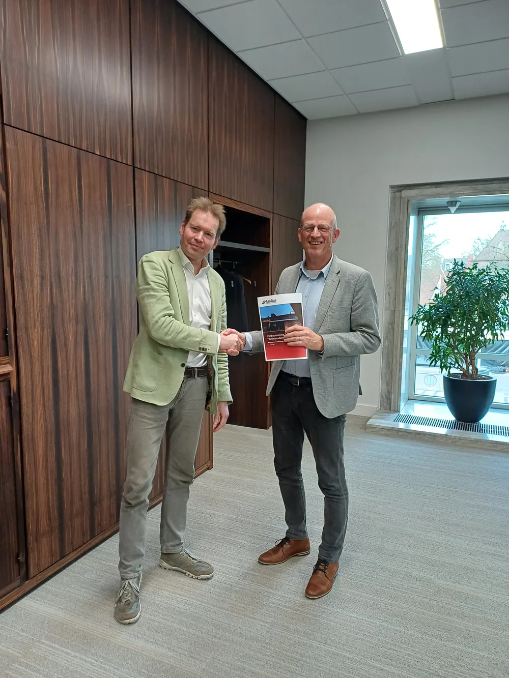 Vandaag tekenden wethouder Jan Engels en Jan Wilms, regiodirecteur van Van Dorp Installaties, de bouwovereenkomst voor de verduurzaming van zwembad Brilmansdennen.