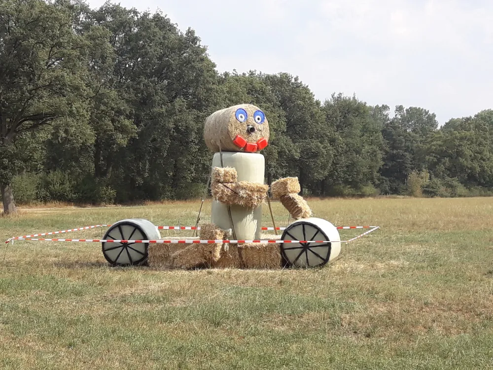 Na de route verkend te hebben is er gekozen om een grote pop van grasbalen in een weiland van één van de leden te plaatsen aan de grensweg. Deze pop van ronde balen moest natuurlijk wel op een step komen te staan. Hiervoor was enige creativiteit nodig, maar dat was geen probleem voor de bedrijfsopvolgers. Ronde grasbalen in plastic en zonder plastic en vierkante grasbalen aangevuld met kleine strobalen is de pop ontstaan. Voor het gezicht en de wielen waren andere voorwerpen en hulpmiddelen nodig om het tot een geheel te maken.