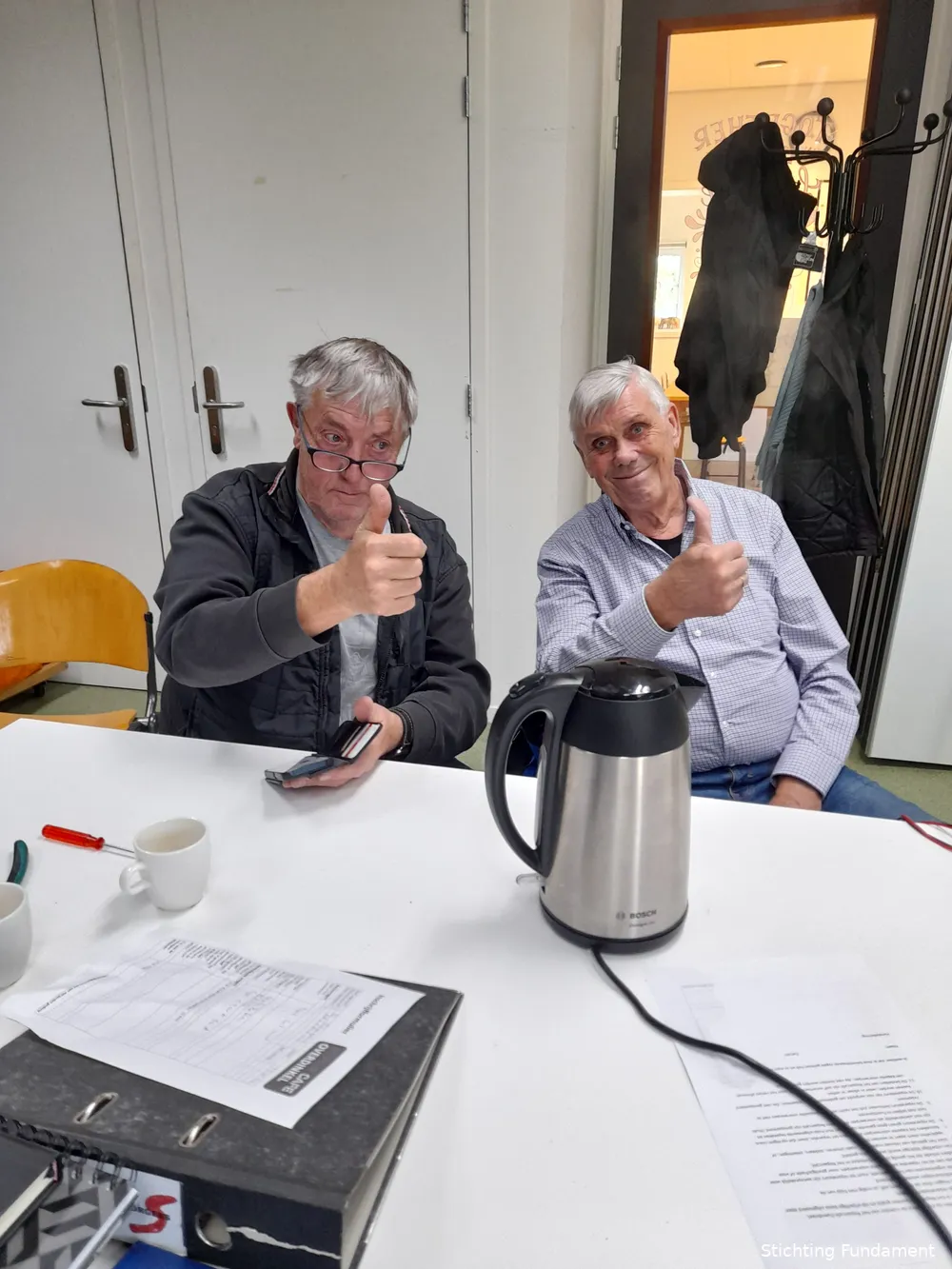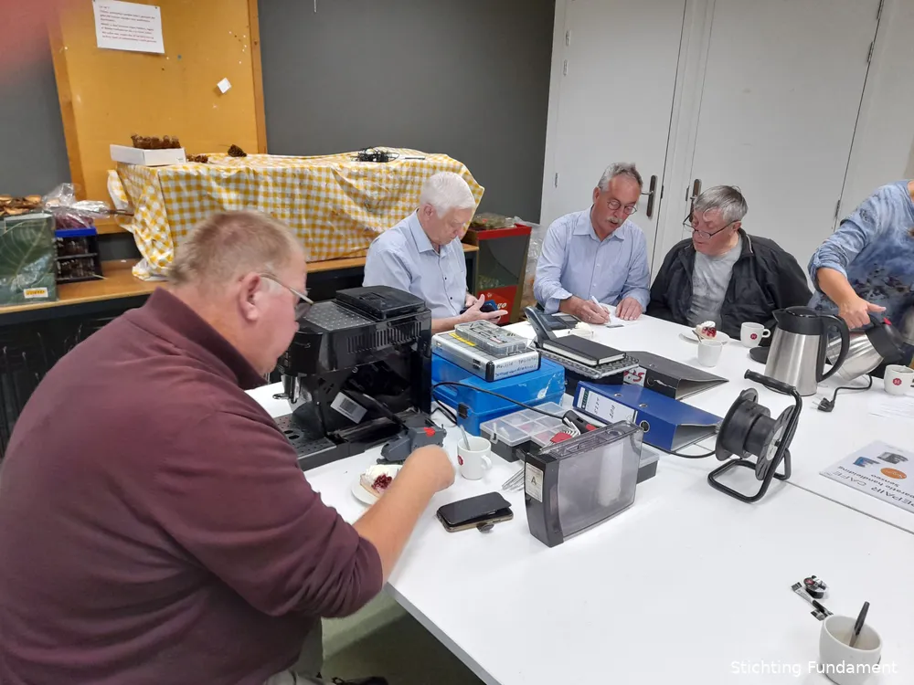 De handige heren kregen direct een aantal items binnen en gingen dan ook enthousiast aan de slag. Een waterkoker, waterboiler en een koffiezetapparaat dienden als de eerste projectjes. Waarbij de waterkoker officieel de boeken in gaat als het eerste gerepareerde item. Uiteraard werd de eerste bijeenkomst samen gevierd met gebak en als kers op de taart kwamen er ook nog een aantal geïnteresseerde heren binnen, die meteen zijn opgenomen in de groep. Hiermee is de reparateurspoule inmiddels uitgegroeid tot tien personen.